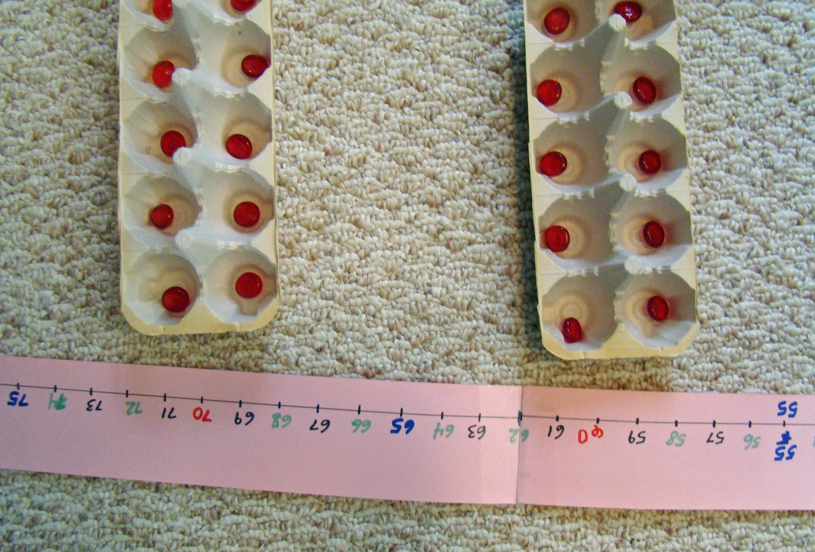 For these ten-frames, I cut off the lid and one set of the egg-holes so there are ten holes in two rows of five. I use small glass beads that are sold for use in plant vases. You could use anything from buttons to pennies to marbles to fill the ten-frames. You can see that we have quite a number of these egg-carton ten-frames!